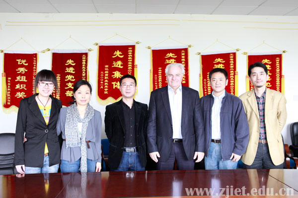 2012年4月12日,德国汉堡港物流学院院长Wolfhard H Arlt教授,德国汉堡教育管理协会(KWB)项目经理吴莉莉女士、浙江省外服国际教育培训中心总经理刘俊一行来我校考察物流实训基地、中德合作理实一体化实训基地和德语中心,并就双方合作事宜进行了会谈。院长李曙明、工商系系主任郭伟刚、副主任张志乔、外事办主任顾鸣镝等相关人员热情接待了来宾。