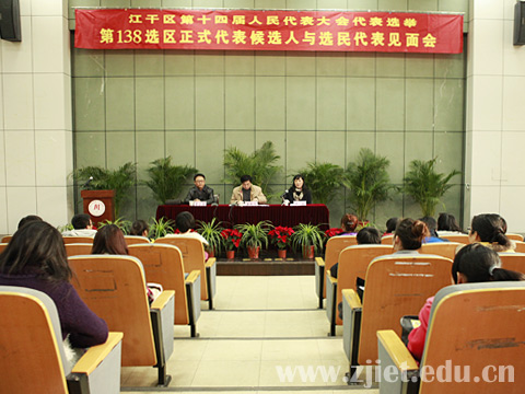 12月13日下午,江干区第十四届人民代表大会代表选举第138选区正式代表候选人与选民代表见面会在我院图书馆报告厅举行。正式代表候选人我院副院长张红、浙江财经学院法学院主持工作副院长李占荣及选民代表参加见面会。见面会由我院纪委书记、工会主席潘新华主持。