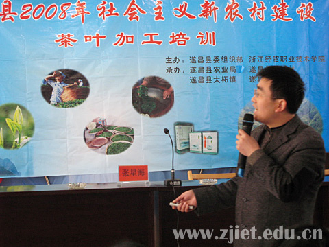 3月4日至5日,我院社会主义新农村建设主题年活动拉开序幕,第一阶段茶叶加工工培训分别在遂昌县大柘镇、石练镇举行。学院党委书记童学敏、副院长卢显林、继续教育处处长何学军、科研处处长韦进,遂昌县组织部部长陈立新、副部长雷伟东,遂昌县农业局林局长,遂昌县供销社徐永强以及当地县乡镇有关领导出席了开班仪式。来自两镇近500名茶农参加了本次培训。