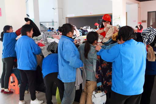 学院后勤部门的困难家庭员工正在挑选师生们爱心捐赠的衣物。