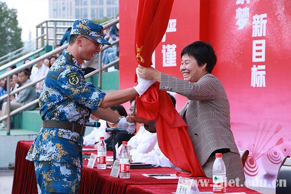 大会上,主席台领导为新生代表佩戴校徽,副校长蒋丽君为军训团授旗。副校长张红向军训团发布训令,她强调,军训是同学们大学生涯必修的第一课,是全面落实人才强国战略、实现中华民族伟大复兴的中国梦的时代要求,希望全体新生要坚持立德树人,按纲组训;要做到统筹协调,科学施训;要端正训练作风,勇于受训。
