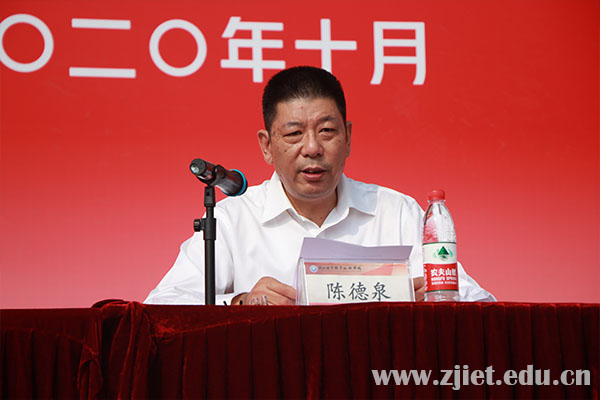 开学典礼在雄壮的《国歌》声中拉开序幕。校长陈德泉向新生们表示祝贺和欢迎,并发表了题为《在时光流淌中成就最好的自己》的讲话。他向新生们介绍了学校的历史沿革、文化精神、特色优势,讲述了学校作为一所年轻而富有底蕴、奋进而充满活力、包容而满载温暖的高职院校四十余载的发展历程,并对全体新生提出四点期望:一是在时光的流淌里坚定信仰,厚植爱国情怀;二是在时光的流淌里勤学励能,练就过硬本领;三是在时光的流淌里修身养德,涵养自我品质;四是在时光的流淌里奋力进取,谱写人生华章。