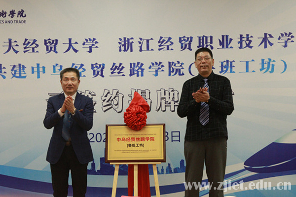 在双方领导和嘉宾的见证下,陈德泉校长和彼得罗·库奇克校长共同签署了《关于共建中乌经贸丝路学院(鲁班工坊)合作谅解备忘录》。劳赐铭和陈德泉共同为“中乌经贸丝路学院(鲁班工坊)”揭牌。