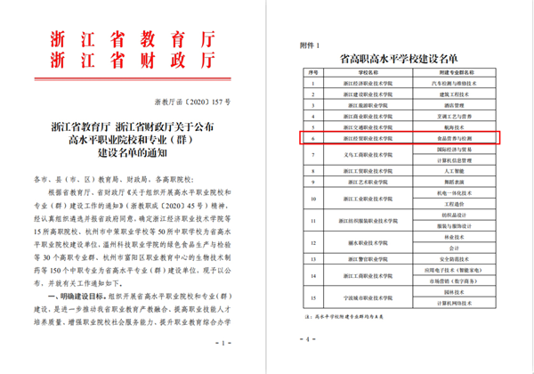 日前,浙江省教育厅、浙江省财政厅发布《关于公布高水平职业院校和专业(群)建设名单的通知》(浙教厅函[2020]157号),确定15所高职院校、50所中职院校为浙江省高水平职业院校建设单位。我校被成功确定为“省高水平职业院校建设单位”,食品营养与检测专业群被确定为“高水平学校附建专业群(A类)。