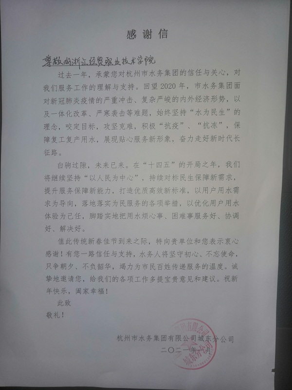近日,学校收到杭州水务集团有限公司城东分公司发来的感谢信,感谢学校在2020年对水务工作的理解与支持。