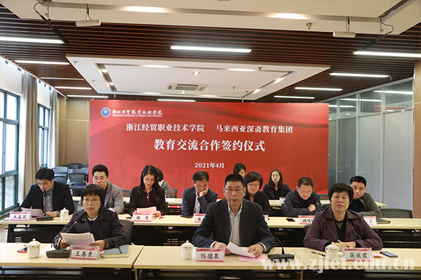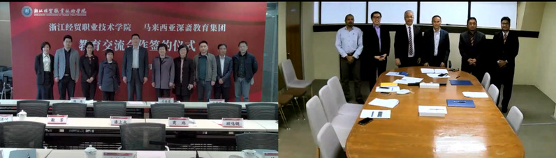 4月7日下午,学校与马来西亚深斋教育集团交流合作签约仪式在教师发展中心举行。学校校长陈德泉、副校长蒋丽君,马来西亚深斋教育集团执行董事胡恩林,首席执行官杨锡水,康博国际学院校长阿末占利博士,深斋技术职业学院副校长阿滋祖易茂出席仪式。签约仪式以线上视频会议方式举行,由国际交流与合作中心主任王春青主持。