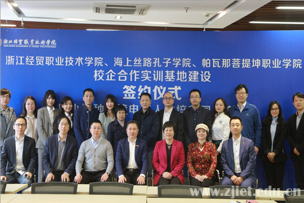 学校党委书记劳赐铭、副校长蒋丽君,中国驻泰国大使馆教育参赞冯俊英、中外语言交流合作中心-曼谷中心事务代表王会昌,泰国海上丝路孔子学院理事会主席颂德通猜大师、中方院长王尚雪,帕瓦那•菩提坤职业学院校董素贴、院长纳龙,泰王国职教委副秘书长蒙通,中国(杭州)跨境电商联盟副秘书长吴功兴,合作企业代表汤叶灿、邢海,校友企业代表滕金玉、吴富琴,以及国际贸易系领导班子出席了线上签约仪式。
