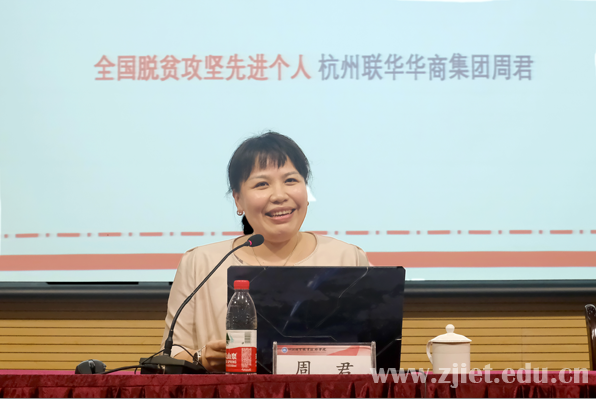 她用生动质朴的语言,讲述了决战脱贫攻坚中用脚步丈量的减贫之路、用方法致富的扶志之道、用行动志启共富未来的扶贫事迹。周君深刻认识到东西部扶贫协作和对口支援是推动区域协调发展、协同发展、共同发展的重大战略,主要推动“31590”项目建设,设立“3”家消费扶贫示范店、“15”个扶贫馆,“90”个扶贫售卖专区,联动打造消费扶贫新模式,至今已对接13个省市自治区、32个县市,帮扶采购品种1600余个,助销量近6.73万吨、助销额突破6.08亿元。从黔东南到恩施,从西藏那曲到新疆阿克苏,从吉林长春到淳安临岐,她以“责无旁贷舍我其谁”的担当,打出了联华华商集团的消费扶贫组合拳,直击消费扶贫的“最后一公里”。她用实际行动践行了一名共产党员的责任与担当,用感人的事迹勉励在场师生认真制定目标,锻炼系统性思维,勇担时代使命,保持至善之心。周君的事迹分享声情并茂,引起在场师生的强烈共鸣,赢得阵阵热烈的掌声。