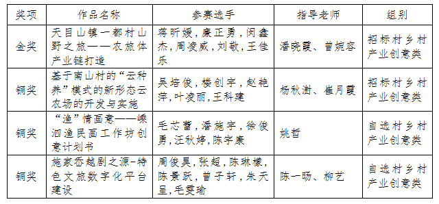 11月28日,“裕农通杯”第四届浙江省大学生乡村振兴创意大赛主体赛获奖名单公布,我校参赛队荣获1项、铜奖3另外德清数字乡村专项赛立项1项