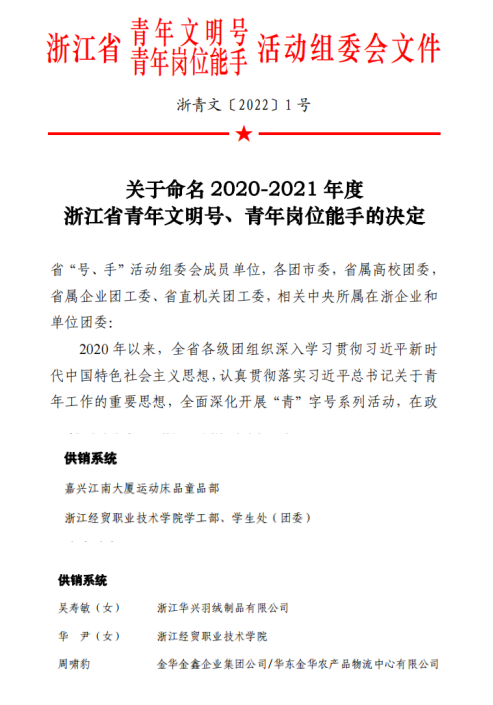 近日,浙江省青年文明号、青年岗位能手活动组委会发布《关于命名 2020-2021 年度省级青年文明号、青年岗位能手的决定》(浙青文〔2022〕1 号),我校学工部、学生处(团委)被命名为2020-2021年度省级青年文明号、人文旅游学院华尹老师被认定为2020-2021年度省级青年岗位能手。