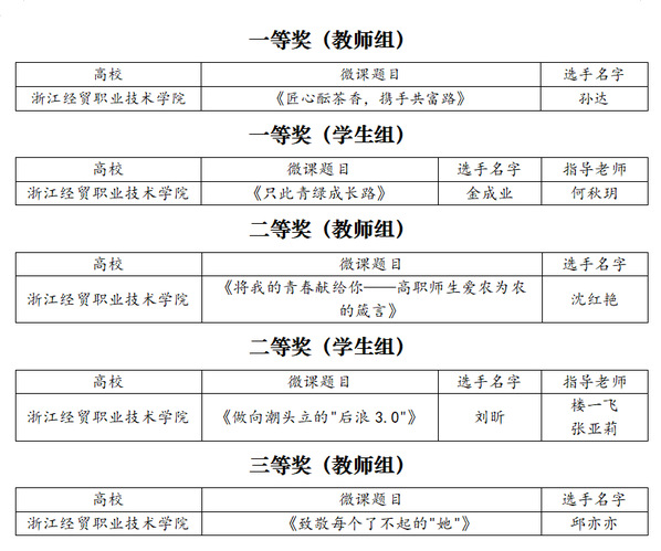 近日2022年度浙江省思政微课大赛决赛落下帷幕,我校共有6位选手参赛经过复赛和决赛的层层筛选,我校5名参赛选手全省近百所院校的605名参赛选手中脱颖而出,一等奖2项,二等奖2三等奖1项