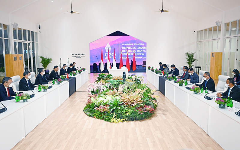 当地时间11月16日晚,国家主席习近平在巴厘岛同印度尼西亚总统佐科举行会谈。新华社记者 张领 摄
