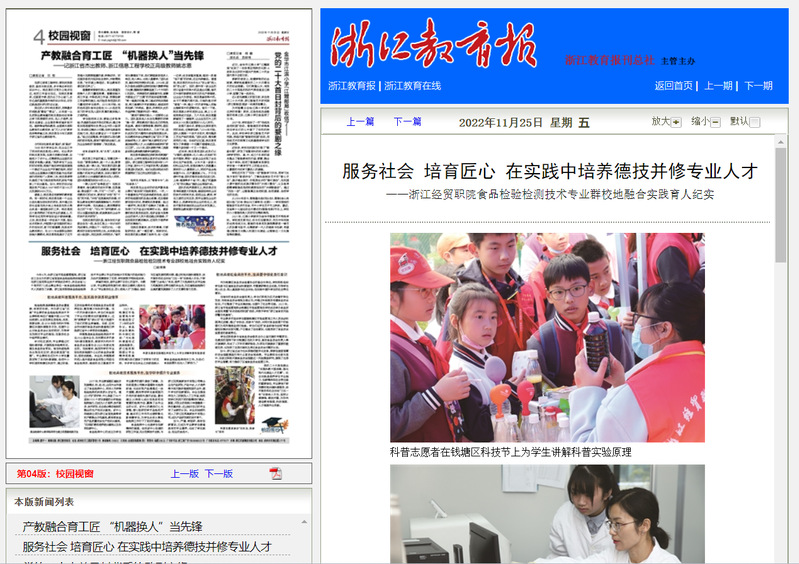 在每年的食品安全宣传周上,学生们积极为区内各餐饮单位发放、张贴食品安全海报及倡议书,并通过快检服务传播食品安全知识,不仅锻炼了专业实操技能,也提升了社会责任感。2021年,浙江省市场监管局联合钱塘区市场监管局在学校成功举办食品安全宣传周暨“你点我检进校园”活动,并授予学校“浙江省食安风险预警交流基地”。
