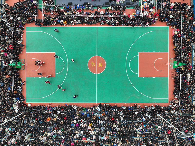 这是2023年3月27日在贵州省黔东南州台江县台盘村拍摄的贵州省首届“美丽乡村”篮球联赛总决赛比赛现场(无人机照片)。新华社记者 欧东衢 摄