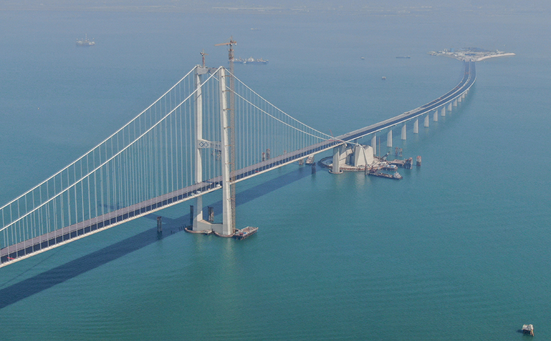 2023年11月28日,粤港澳大湾区超级工程深中通道主线正式贯通,这是深中通道伶仃洋大桥东塔及西人工岛(无人机照片)。新华社记者 邓华 摄