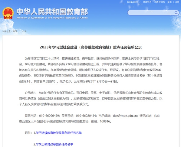 为贯彻落实党的二十大精神,推进职业教育、高等教育、继续教育协同创新,推进全民终身学习的学习型社会、学习型大国建设,教育部印发通知明确了学习型社会建设重点任务,并组织实施了学习型社会建设推进工程。本次申报由省级教育行政部门组织、审核、推荐,全国高校共申报了832项任务。经过教育部评议,最终确定了100项学历继续教育教学改革创新任务、100项非学历教育改革创新任务以及50项探索三教统筹协同创新路径任务入围培育建设名单。