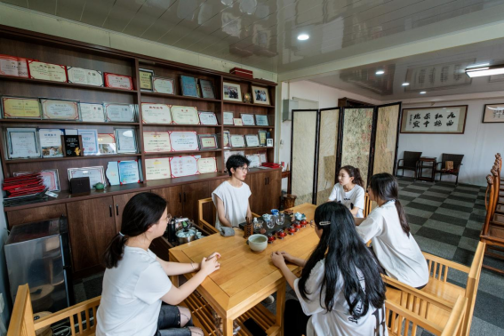 为了进一步洞察茶产业的未来趋势,项目小组特地前往杭州富阳区的“清如茶肆”,茶馆主理人徐兰香师姐与师弟师妹们分享了她在现代茶产业发展浪潮中的实践,引发了在场同学们深刻思考。