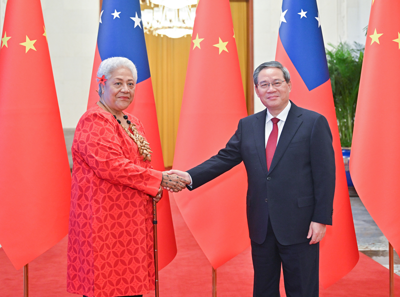 国务院总理李强11月26日上午在北京人民大会堂同来华进行正式访问的萨摩亚总理菲娅梅举行会谈。