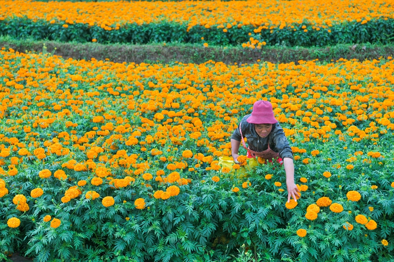 2024年7月30日,村民在贵州省威宁县双龙镇高坡村采摘万寿菊。新华社记者 杨文斌 摄