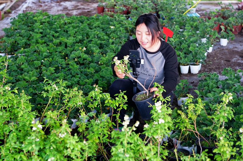 2024年4月27日,在山东省惠民县姜楼镇立冉果蔬种植合作社,工作人员在直播卖蓝莓苗。新华社记者 郭绪雷 摄