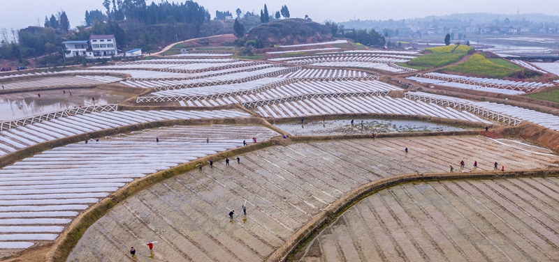 2024年3月6日,在四川省广安市前锋区观塘镇仁和村,农民在高标准农田育秧(无人机照片)。新华社发(周修建 摄)
