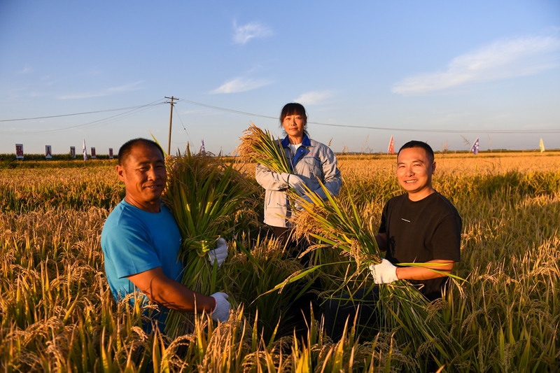 2024年9月20日,在位于吉林省永吉县万昌镇的永吉县禾谷丰水稻种植农民专业合作社,负责人张帅(右一)和两位农民手捧收获的水稻。新华社记者 张楠 摄