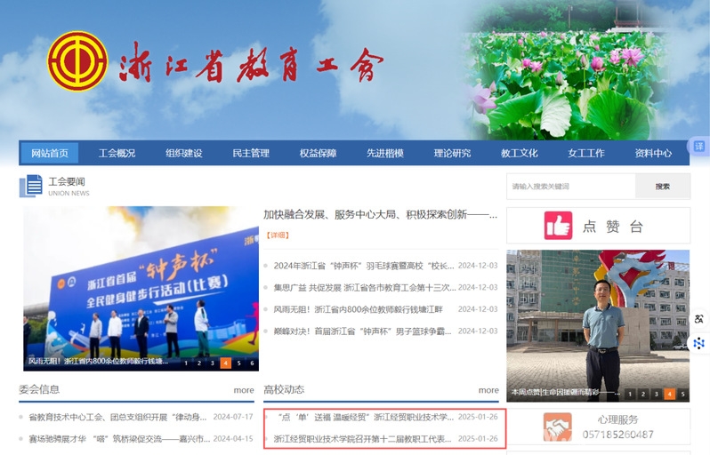 浙江省教育工会门户网站是浙江省教育工会的重要宣传阵地,“高校动态”栏目遴选、发布省教育工会直属40家高校工会的典型活动新闻,是展示浙江省高校工会风采的重要平台。自2024年12月完成组织关系调整后,学校工会积极参加省教育工会组织的各项活动,通过主动汇报展示、在会员大会上作典型交流发言、在宣传平台上发布活动新闻等方式展示学校风采,取得了一定的效果,为讲好经贸故事,助力学校高质量发展积极营造良好社会氛围。